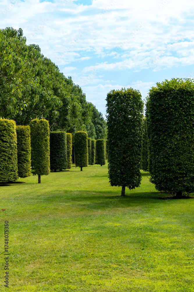 Neatly trimmed hedge of European or common hornbeam (Carpinus betulus) in Krasnodar or Galitsky city landscape park. Cylindrically trimmed trees form symmetrical green path across lush lawn.