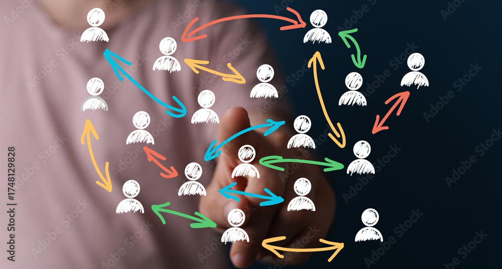 Hand pointing at network diagram. Teamwork, communication, connection, collaboration, success, growth, strategy, partnership, interac
