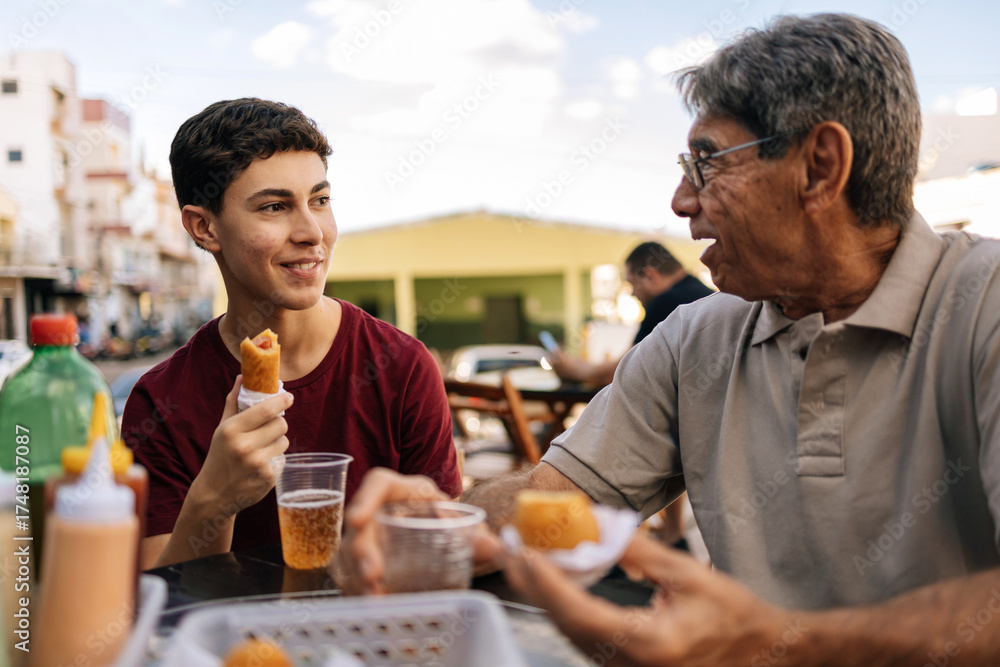 Grandfather and teenage grandson enjoying traditional Brazilian snacks - coxinha and sausage roll - while drinking guarana soda at a street food stall