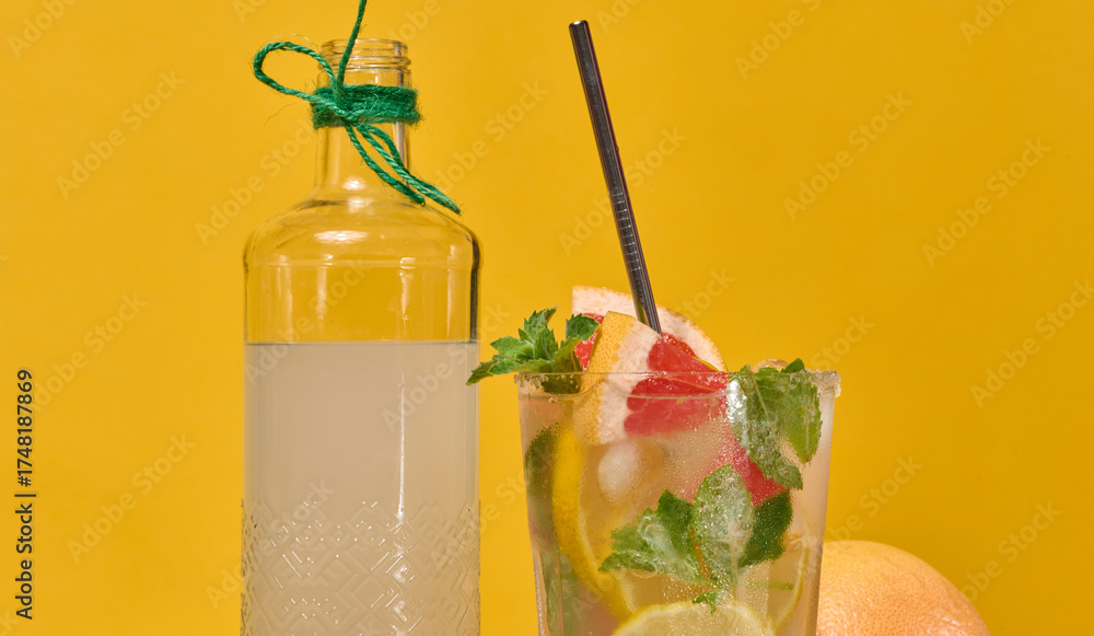 Glass bottle with homemade lemonade and a glass with a cold cocktail, citrus pieces inside