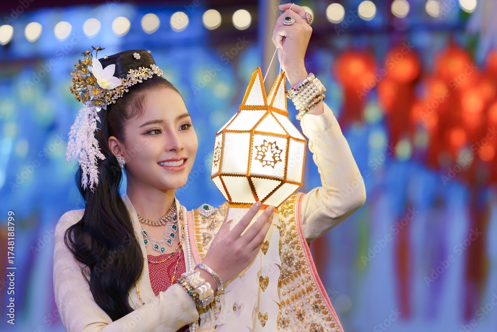Pretty Asian women in Thai traditional costume in the Hundred Thousand Lantern Festival or Yi Peng Festival for worship at Phra That Hariphunchai temple in Lamphun, Thailand.
