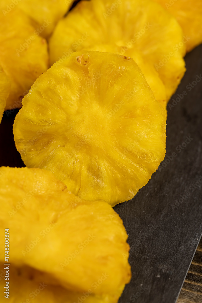 dried bright yellow pineapple fruits on a black slate board, cut into rings and dried yellow clean slices of ripe pineapple for long-term storage and used as a sweet