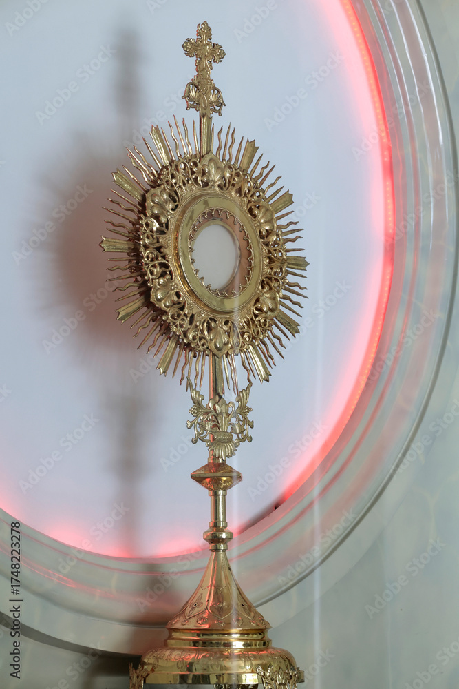 Eucharistic adoration. Monstrance with the body of Christ. Ho Chi Minh city. Vietnam.