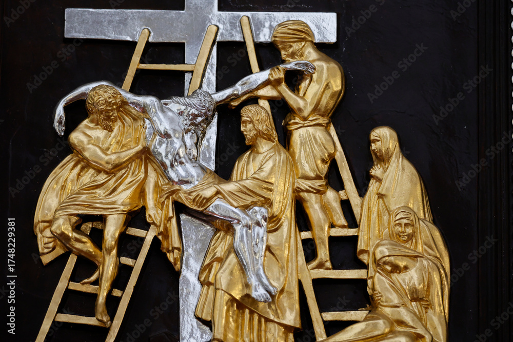 My Tho cathedral. Way of the cross. Station 13. Jesus is taken down from the cross. My Tho. Vietnam.