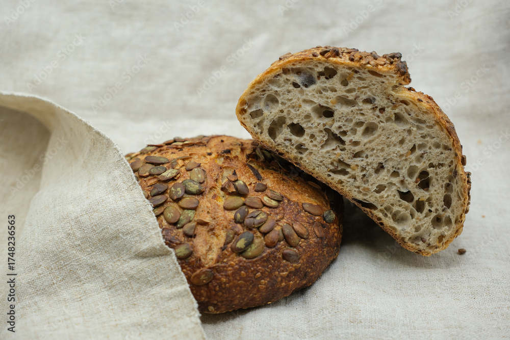 Bread with Pumpkin Seeds and Pulp, and a Slice of Multigrain Bread with Sunflower and Flax Seeds. Tablecloth Made of Natural Hemp. Bread Varieties.