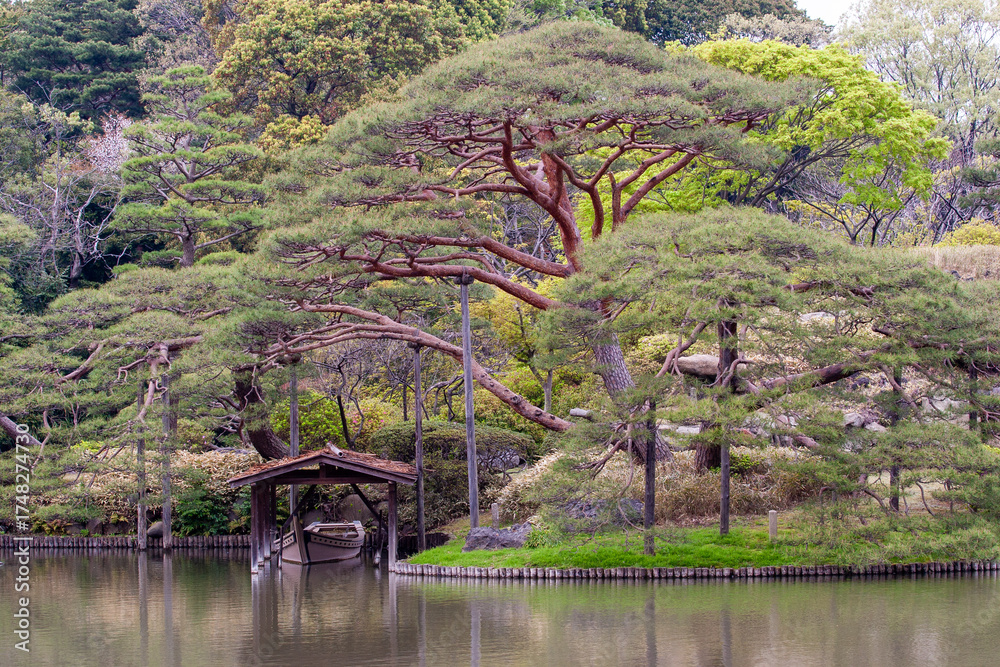 Serene Japanese Garden with Pine Trees and Tranquil Pond