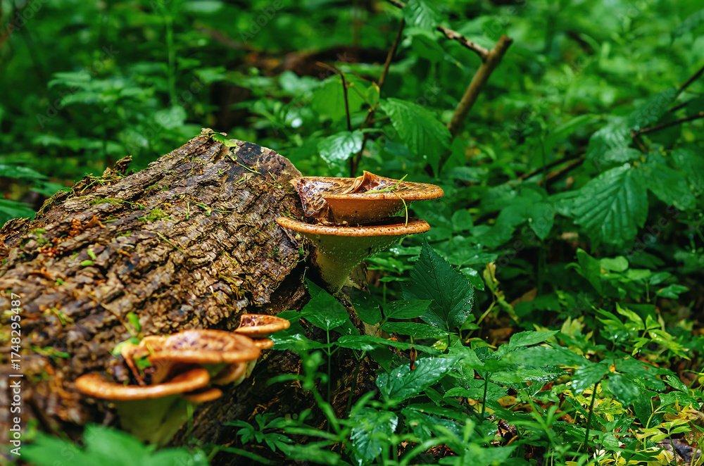 Variegated tinder fungus Cerioporus squamosus , dryad's saddle. Mushrooms on stumps. Wet environment