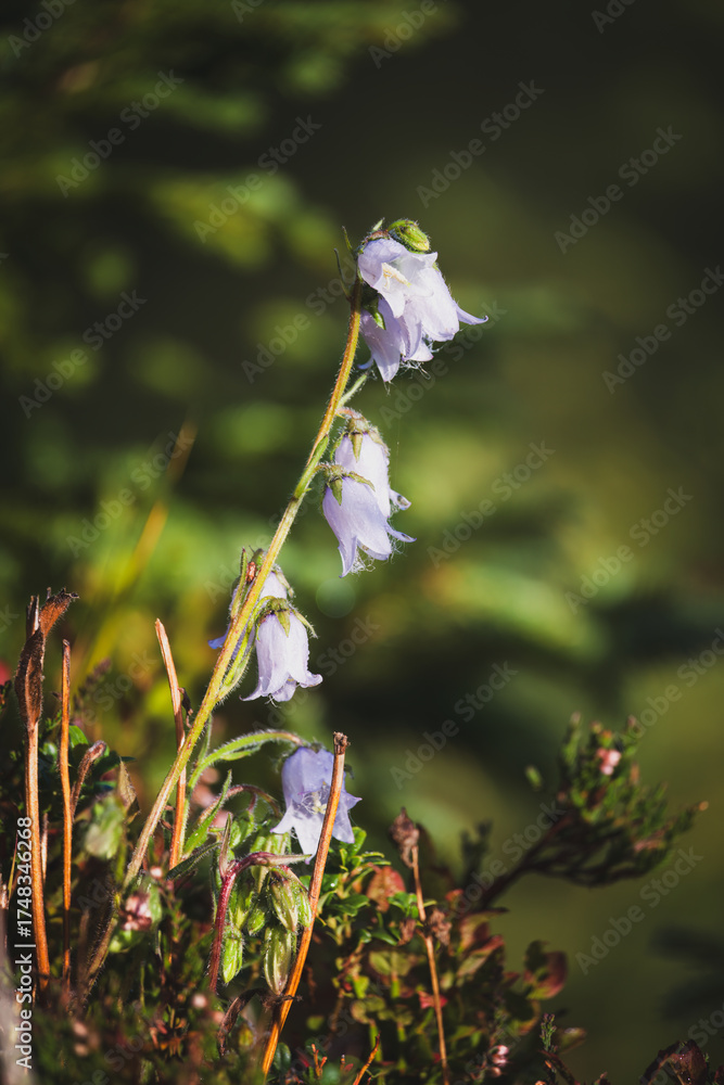 a bearded bellflower, campanula barbata, on a mountain meadow at a sunny autumn morning