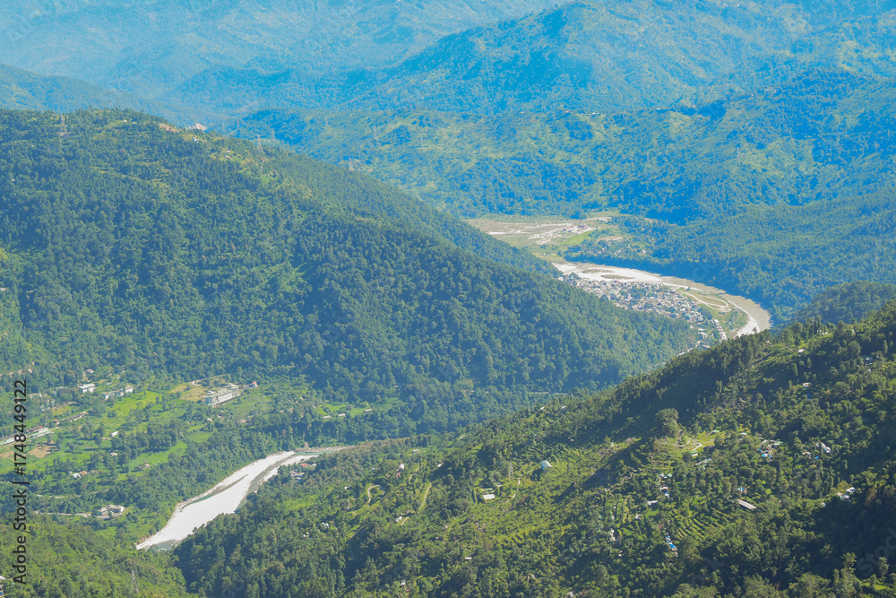 High point view of downstream curvy Tista river flowing through Himalayan mountains, Rinchenpong, Sikkim, India.