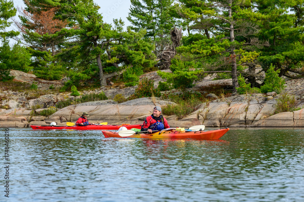 Sea kayaking expedition on Georgian Bay in fall: a young man pauses on the water with rocks and boreal forest in background room for text