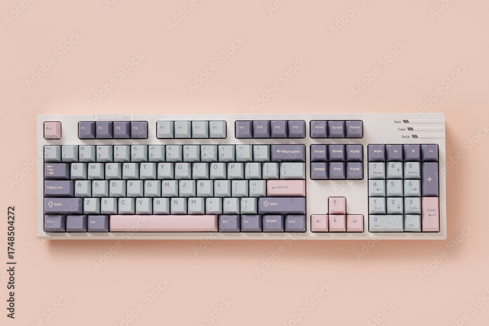 Modern mechanical keyboard on light pink background. Minimal style and design keyboard. Custom build keyboard. Colorful pastel creamy pink and green key cap. Top view.