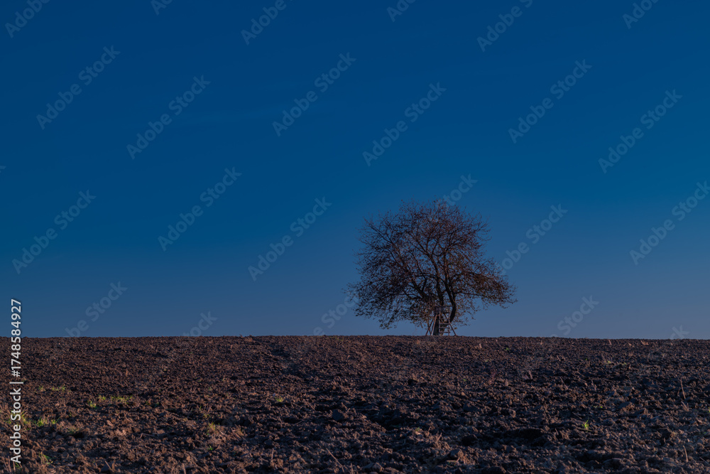 Cherry tree on green field blue sky in Krkonose mountains in autumn