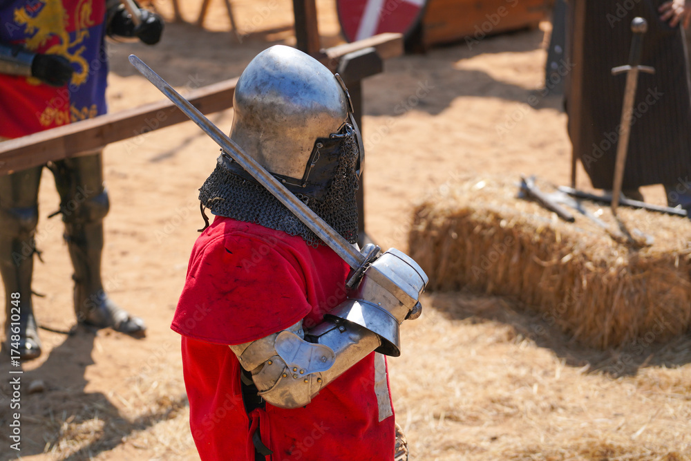Knight in medieval armor with sword and tunic bearing a cross, reenactment scene. Martial aesthetics, historical dynamics, Portugal.