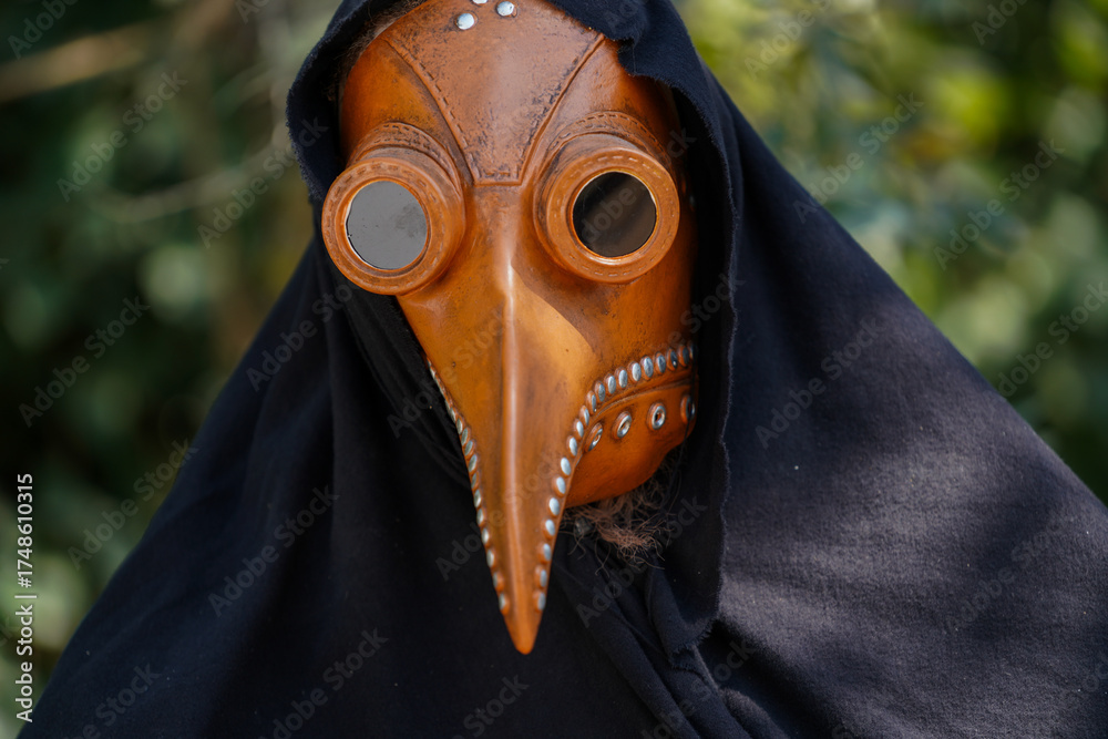 Plague doctor mask with long beak, glass lenses, and hooded cloak against green background. Historical symbolism, medical heritage, Portugal.
