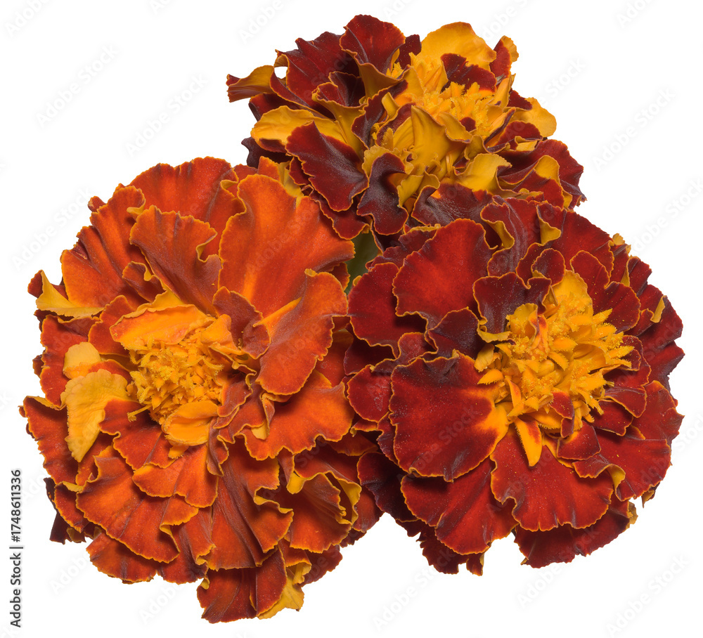 Group of three lush orange red marigold flowers on an isolated background