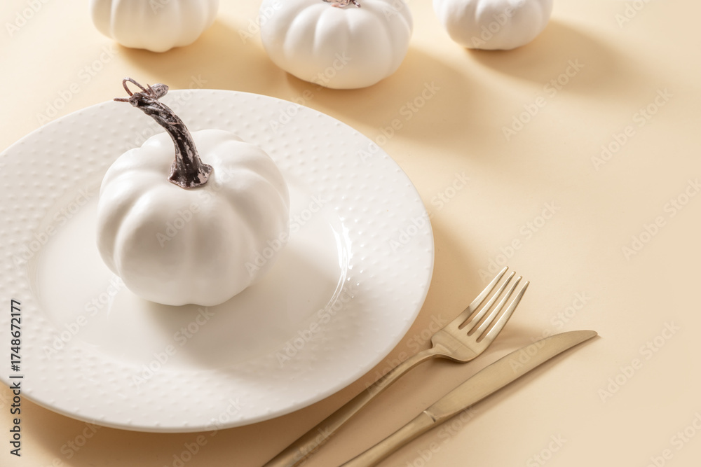 Autumn and Thanksgiving day table setting with plate decorated white pumpkins on beige table. Close up.