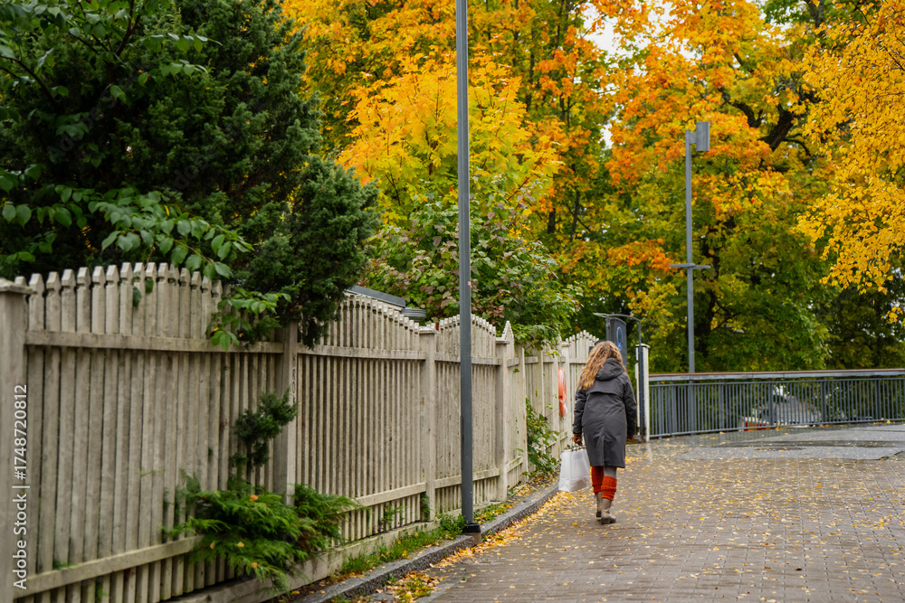 Woman walking along wooden fence on autumn city street surrounded by yellow and green trees showing peaceful seasonal atmosphere, natural beauty, and calm urban environment in fall daylight