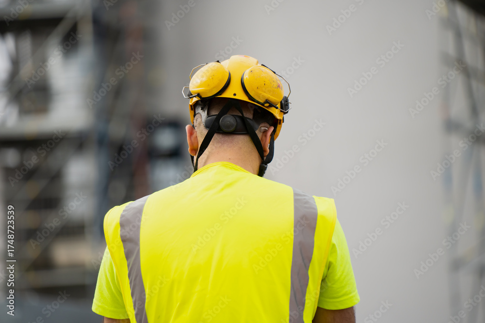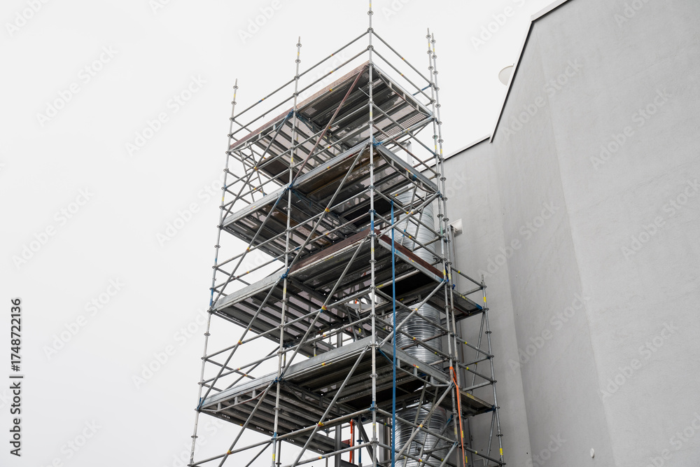 High metal scaffolding tower beside building facade representing construction engineering, renovation work, industrial safety systems, architectural maintenance and modern infrastructure development
