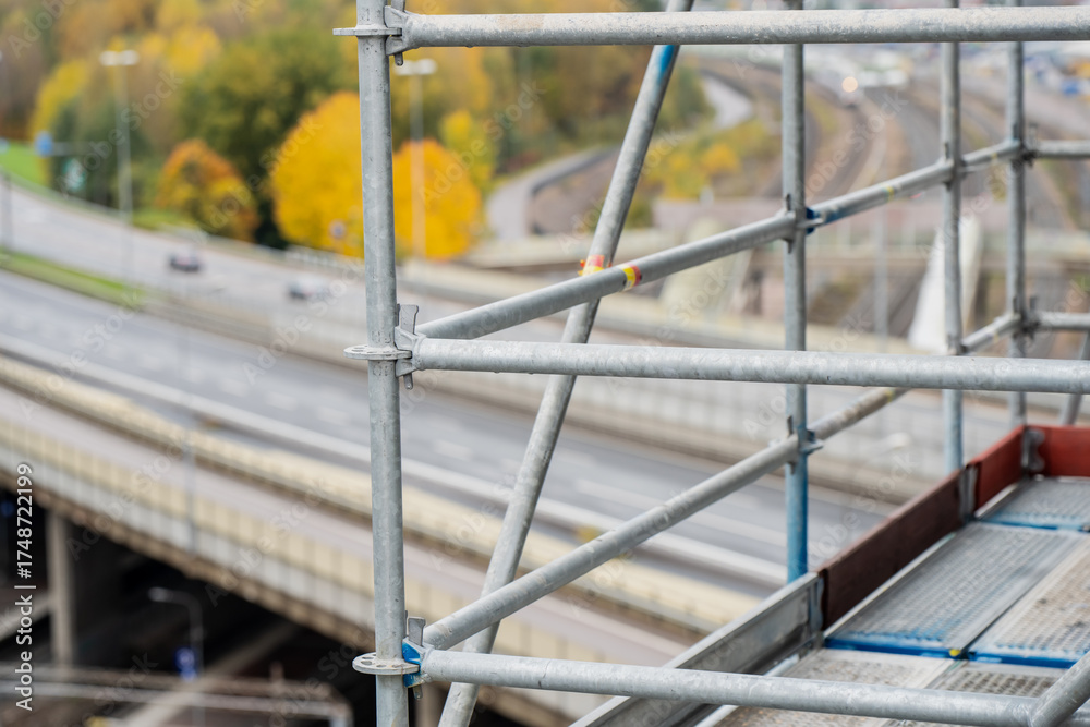 Metal scaffolding frame on construction site overlooking multilayer highway junction with moving cars and autumn trees symbolizing modern infrastructure, renovation and city expansion