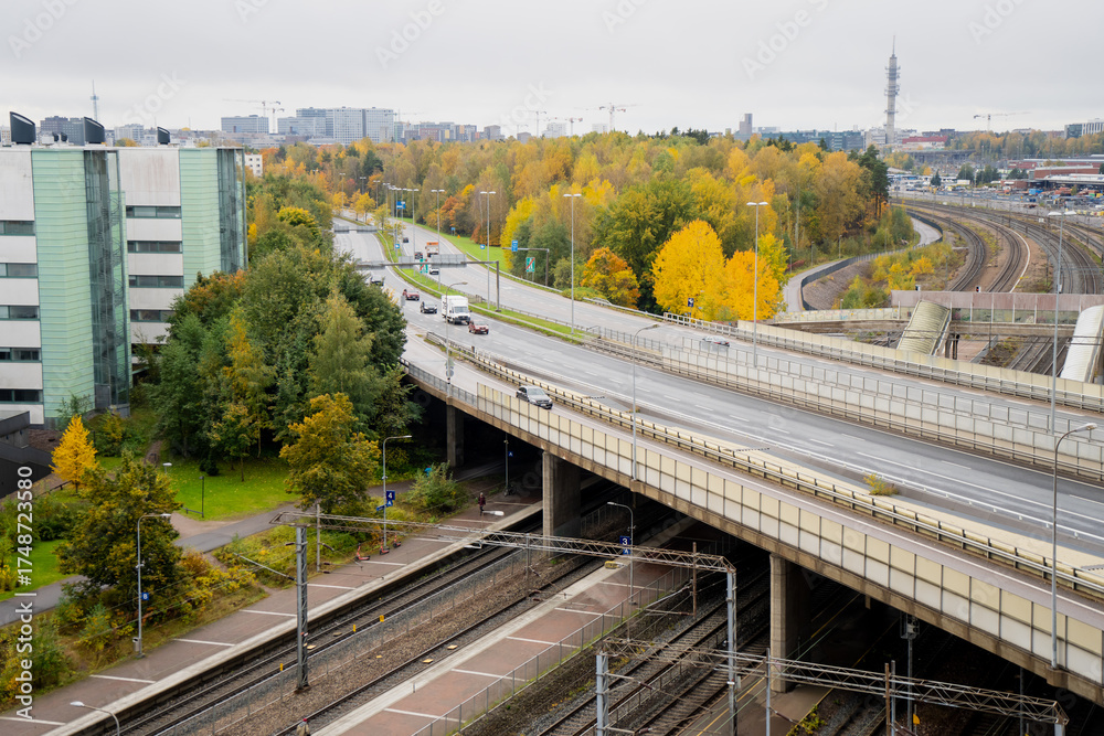 Multilevel highway and railway intersection with moving vehicles surrounded by urban landscape and autumn trees, representing civil engineering, transport infrastructure and city mobility network