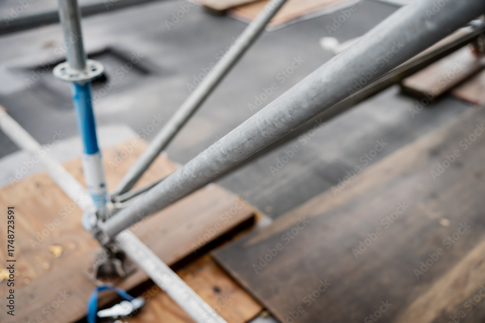 Metal scaffolding support structure with wooden planks at construction area, symbolizing stability, safety and industrial design elements used in building renovation and architectural work