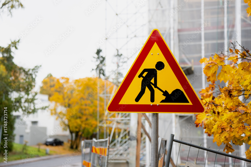 Construction warning sign near renovation site with scaffolding and autumn foliage, illustrating traffic safety, roadwork management and urban infrastructure maintenance in progress