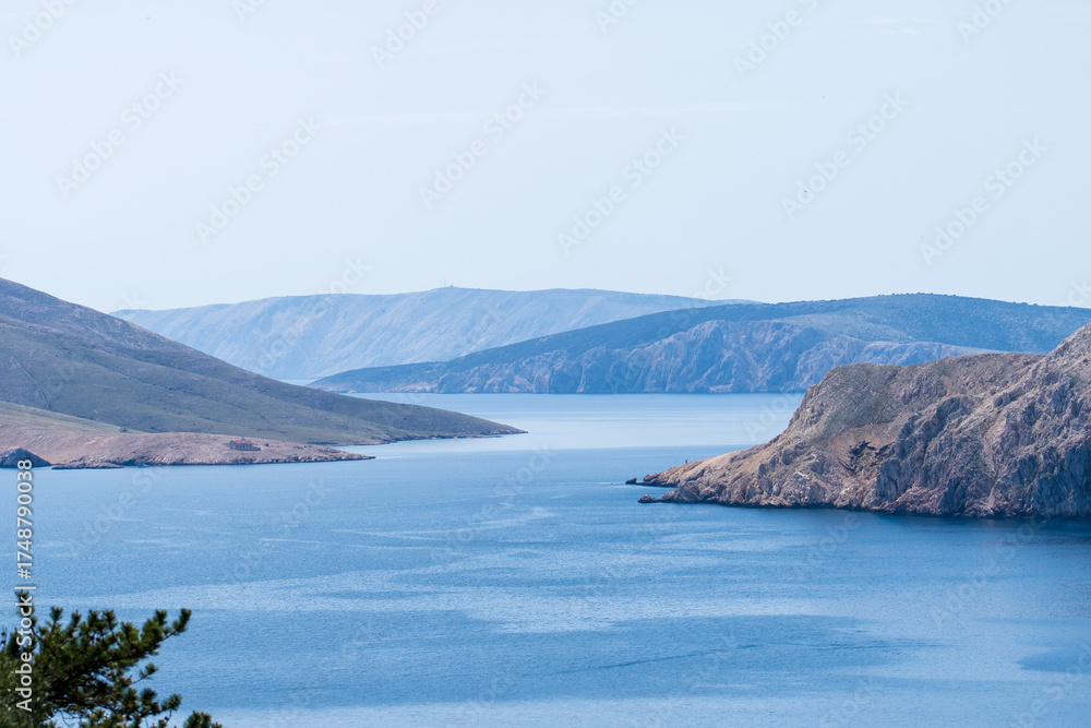 Prvić Island and Sveti Grgur, Croatia - April 20, 2025: Panoramic view of the mountains and sea.