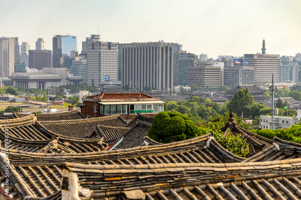 Seoul panoramic view from old narrow street and traditional Korean houses of Bukchon Hanok Village in Seoul, South Korea