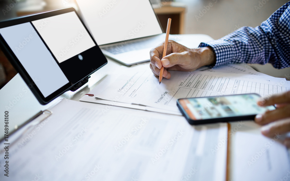 asian man working online via laptop, tablet and mobile phone checking e-commerce form and order from customers, e-commerce online business concept