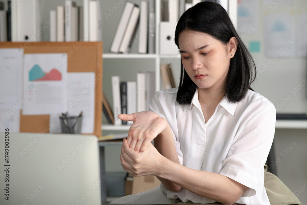 Young Asian Businesswoman suffering from wrist pain while working on computer, Businesswoman massaging her hand and wrist after long hours in front of a computer, Healthcare office syndrome concept