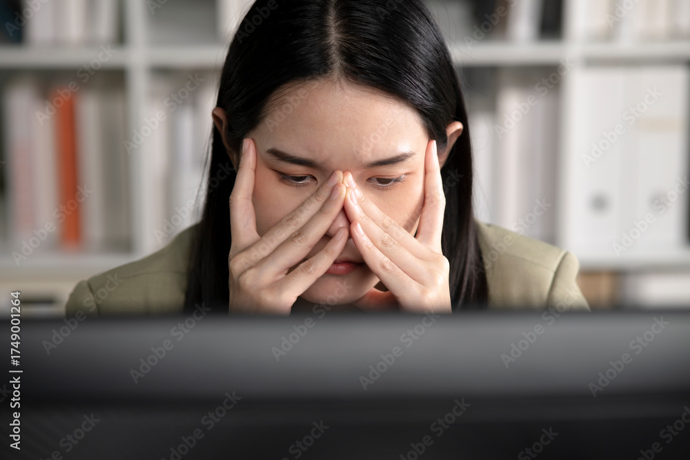 Young Asian Businesswoman looking stressed from work, Young businesswoman working at office feels overworked and burnout