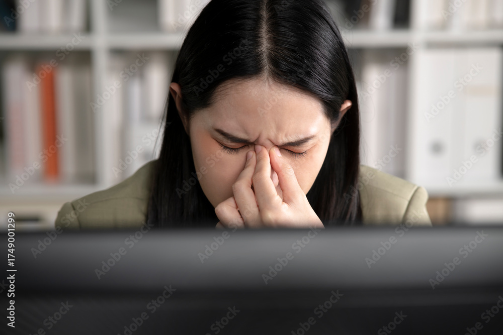 Young Asian Businesswoman suffering from eyestrain while working on the computer, Young businesswoman working at office feels overworked and burnout, Healthcare office syndrome concept