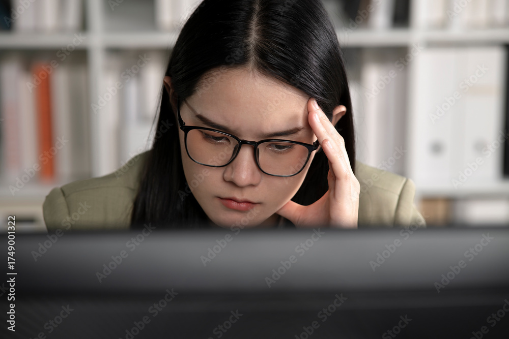 Young Asian Businesswoman looking stressed from work, Young businesswoman working at office feels overworked and burnout
