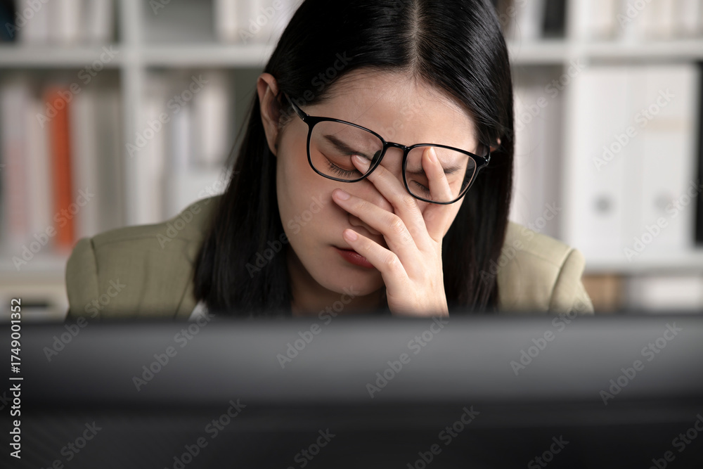 Young Asian Businesswoman suffering from eyestrain while working on the computer, Young businesswoman working at office feels overworked and burnout, Healthcare office syndrome concept