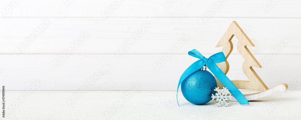 Christmas ball with decorative wooden tree on colored background. decoration bauble with ribbon bow with copy space
