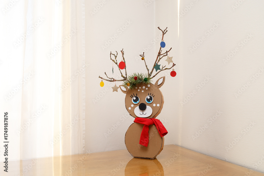 Whimsical reindeer craft with twig antlers and vibrant ornaments, perfect for children content, greeting cards, holiday ads, craft tutorials, and seasonal product packaging