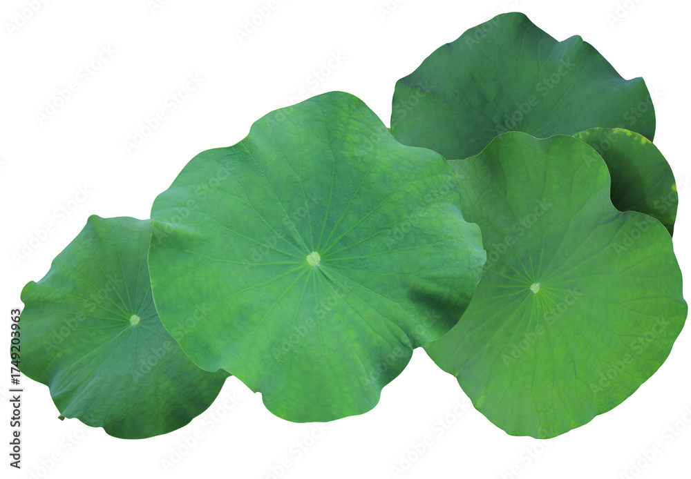 isolated close-up photograph of vibrant, lush green water lily or lotus leaves (nelumbo nucifera) overlapping gently, set against a clean transparent background.