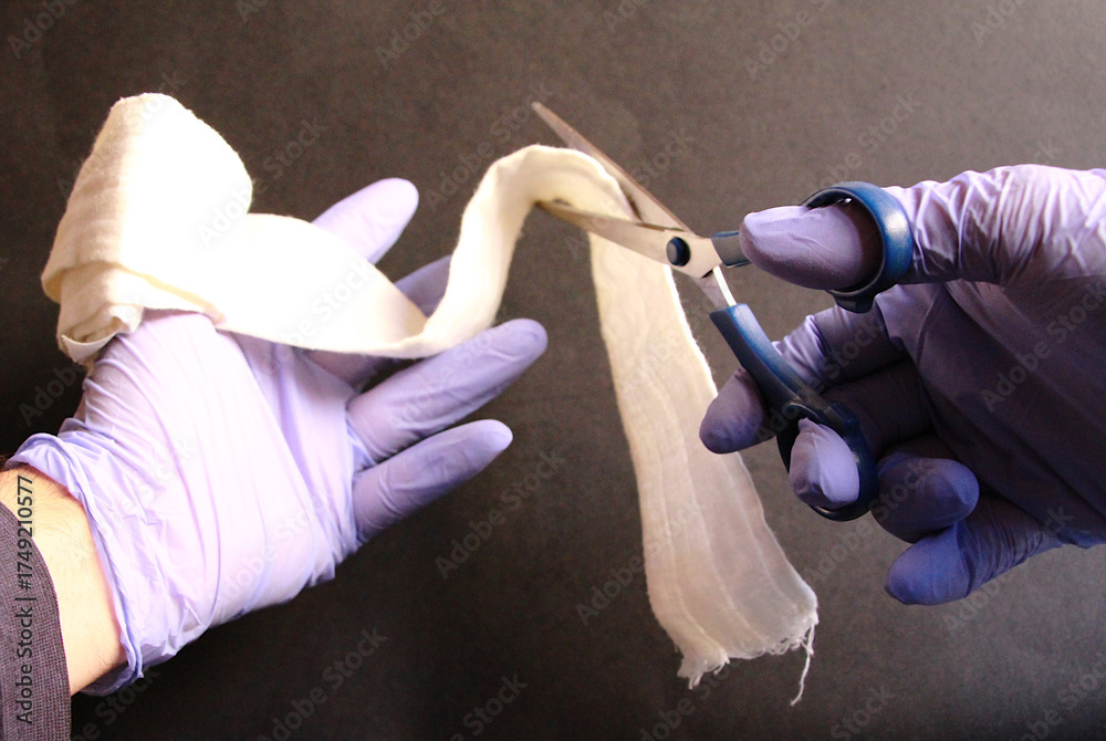 Manos de médico de hospital con tijera y guantes de látex azules cortando venda