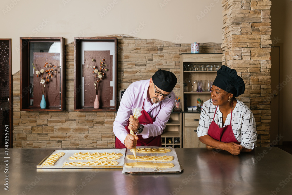 Experienced baker piping filling onto pastry dough while apprentice watches