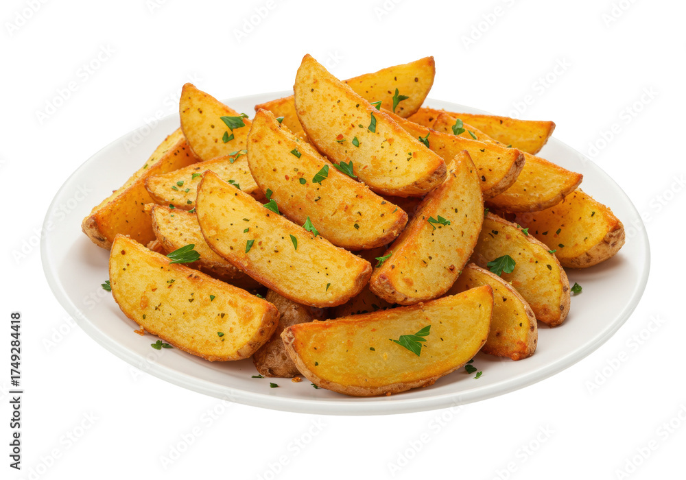 Golden potato wedges isolated on a plate, seasoned with herbs and spices, a delicious and savory side dish for restaurants and food blogs