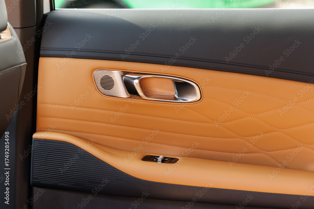 Luxury Door Handle on Premium EV Panel. Close-up of a stylish door handle embedded in an orange leather door panel of a high-end electric vehicle
