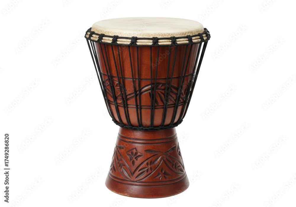 Brown djembe drum isolated on white, traditional African percussion instrument with carved wood and goatskin head for music and rhythm