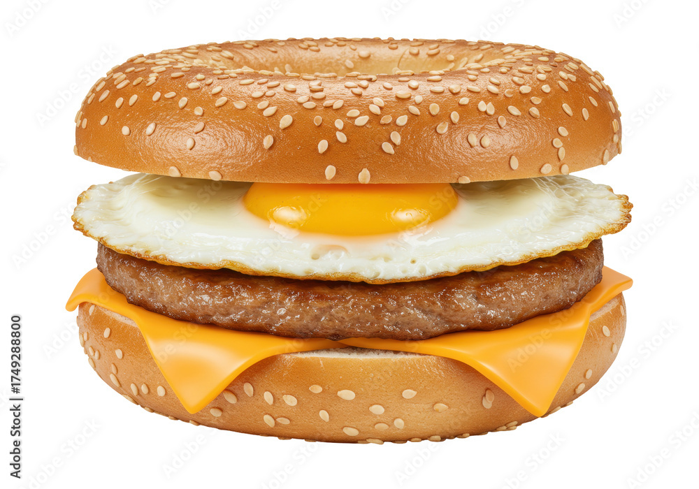 Delicious bagel breakfast sandwich with egg, sausage, and cheese isolated, a tasty and satisfying morning meal on a transparent background
