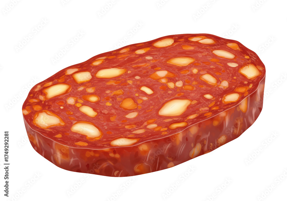 Delicious chorizo slice isolated PNG, cured pork sausage with paprika for Spanish cuisine and tapas ingredient