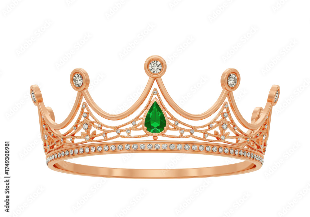 Elegant rose gold crown with emerald and diamonds isolated on transparent background, royal jewelry for queen or princess PNG