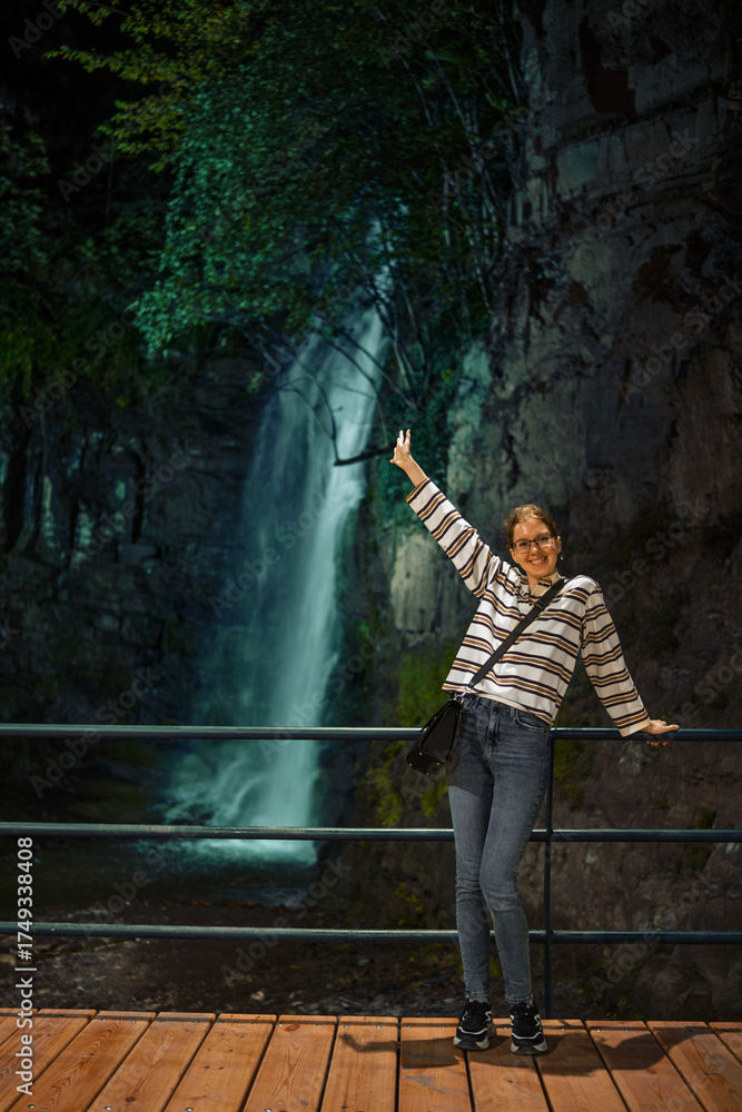 Woman enjoying a scenic view of a waterfall at night in a serene outdoor setting