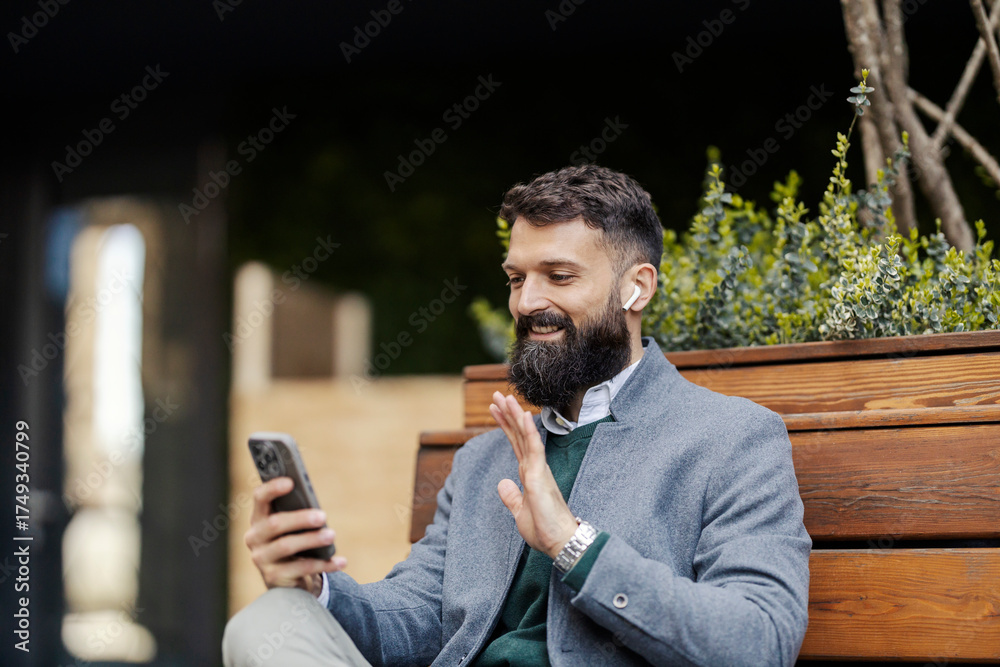 Portrait of friendly cheerful business casual man sitting on a bench on a city street with cellphone in hand and waving at it during online video call.
