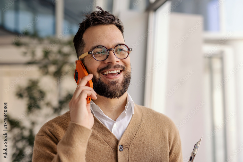 Confident Smiling Businessman Talking on Phone in Bright Office Setting