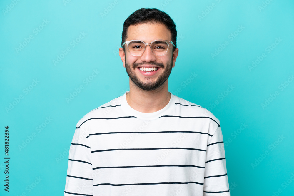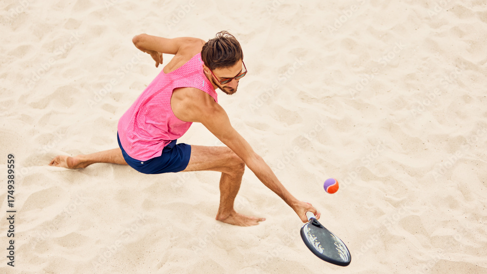 Male athlete hitting paddle ball in low stretch position on sand court. Concept of effort, sport, competition, determination, summer training and dynamic athletic emotion.