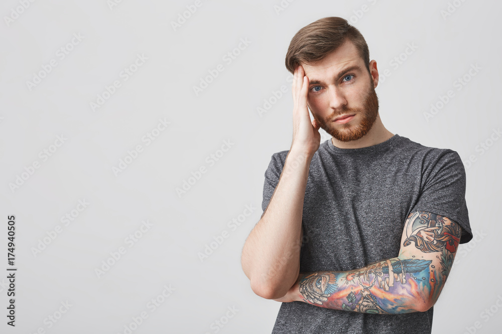 Close up of beautiful unhappy bearded hipster man with tattoo and good hairstyle holding head with hand, looking in camera with tired expression being exhausted after first day at work.